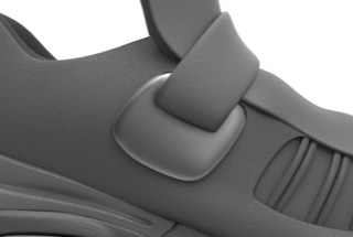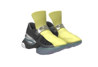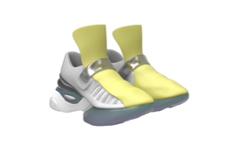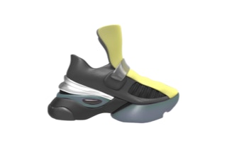 前掌和后跟固定片采用了绿紫渐变,这个颜色灵感来源于最极致的照明:极光。鞋舌用了代表灯光的鲜艳颜色:荧光黄。白色代表白天,与之产生对比的是发泡材质一体成型并采用抛光工艺的后跟,产生黑色镜面效果。黑色版本的后跟采用白色抛光打磨,和黑色鞋面形成强烈对比。