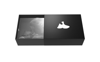 鞋盒采用抽屉式设计。鞋盒的正面是产品的剪影,我们会加以荧光粉,产生更加独特的效果。介于鞋盒和鞋间是透明的PU硬纸,纸上印有变态设计的英文logo。